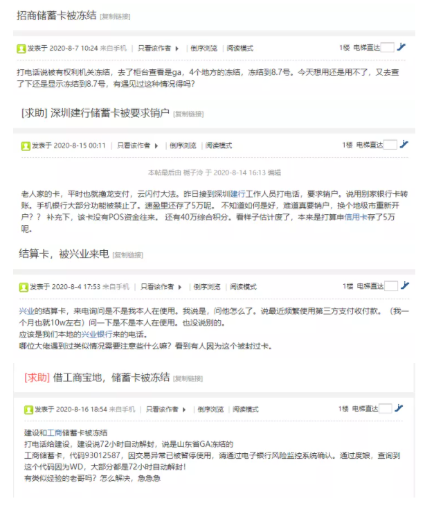 近日,很多網(wǎng)友反映,招商銀行、工商銀行、建設(shè)銀行、興業(yè)銀行等多家銀行卡友的借記卡都忽然被凍結(jié)封卡,原因可能是觸發(fā)了央行反洗錢(qián)系統(tǒng)的監(jiān)管。