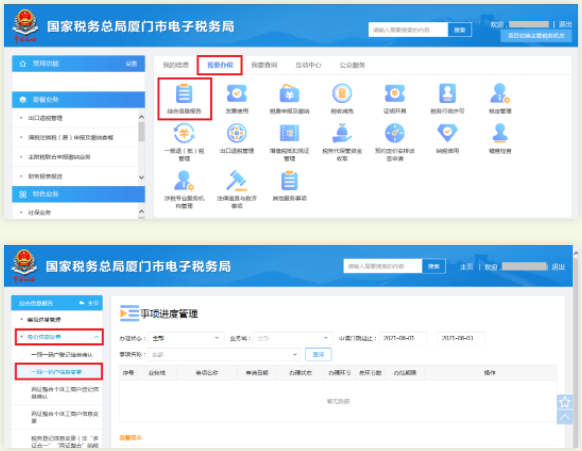 第1步:納稅人登錄杭州市電子稅務(wù)局后,點(diǎn)擊【我要辦稅】→【綜合信息報(bào)告】,選擇左側(cè)【身份信息報(bào)告】→【一照一碼戶信息變更】。