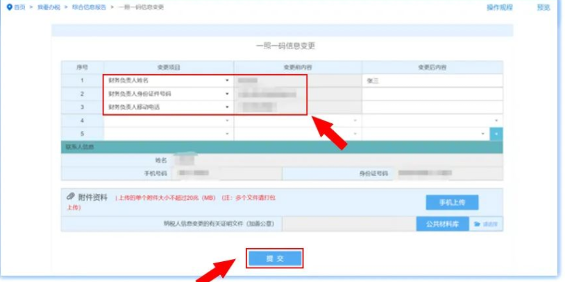 第二步:點(diǎn)擊“變更辦稅人信息”功能在線辦理,將現(xiàn)辦稅人的姓名、證件類型、證件號碼、移動電話等信息輸入變更后內(nèi)容中,提交上傳。
