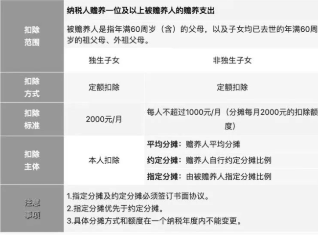 納稅人贍養(yǎng)60周歲(含)以上的父母,或子女均已去世的祖父母、外祖父母,符合獨(dú)生子女的,每月定額扣除2000元;不屬于獨(dú)生子女的,與其兄弟姐妹分?jǐn)偯吭?000元的扣除標(biāo)準(zhǔn),且每人每月最多扣除1000元。