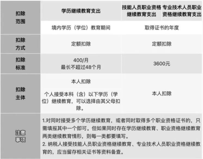 技能人員、專業(yè)技術(shù)人員職業(yè)資格繼續(xù)教育納稅人在取得相關(guān)證書的當(dāng)年,定額扣除3600元,同一年度取得多個(gè)符合條件證書的,比如同一年度同時(shí)取得CPA和稅務(wù)師,只能扣除一個(gè)3600元。