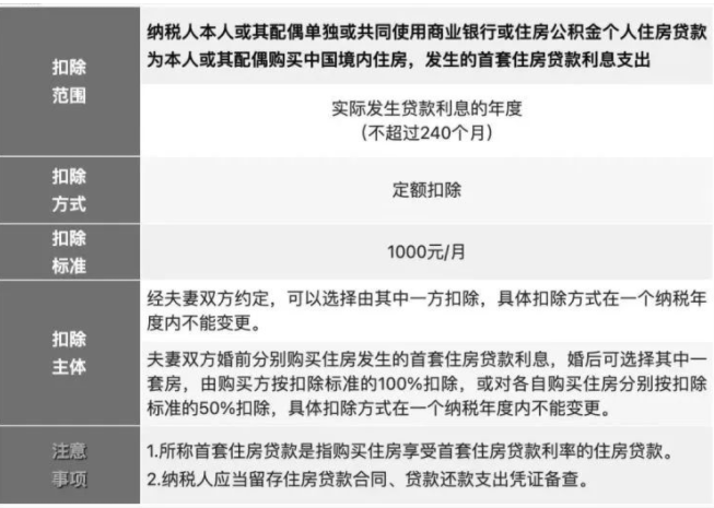 納稅人本人或其配偶單獨(dú)或共同使用商業(yè)銀行或住房公積金個(gè)人住房貸款為本人或其配偶購(gòu)買的在中國(guó)境內(nèi)的符合首套住房的貸款利息支出,在實(shí)際發(fā)生貸款利息支出的年度,按照每月1000元的定額標(biāo)準(zhǔn)扣除,最長(zhǎng)扣除期限不超過20年。