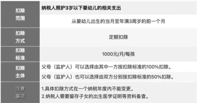 納稅人照護(hù)3歲以下嬰幼兒子女的支出,按照每名嬰幼兒每月1000元的標(biāo)準(zhǔn)定額扣除。扣除方式可以選擇由夫妻一方按照標(biāo)準(zhǔn)的100%稅前扣除,也可以選擇由夫妻雙方分別按照標(biāo)準(zhǔn)的50%扣除。
