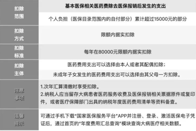 納稅人本人或其配偶、未成年子女發(fā)生的與基本醫(yī)保相關(guān)的醫(yī)藥費(fèi)支出,在扣除醫(yī)保報(bào)銷后,自付部分本年度累計(jì)超過15000元,且不超過80000元的部分,準(zhǔn)予在計(jì)算個(gè)人所得稅應(yīng)納稅所得額時(shí)扣除。